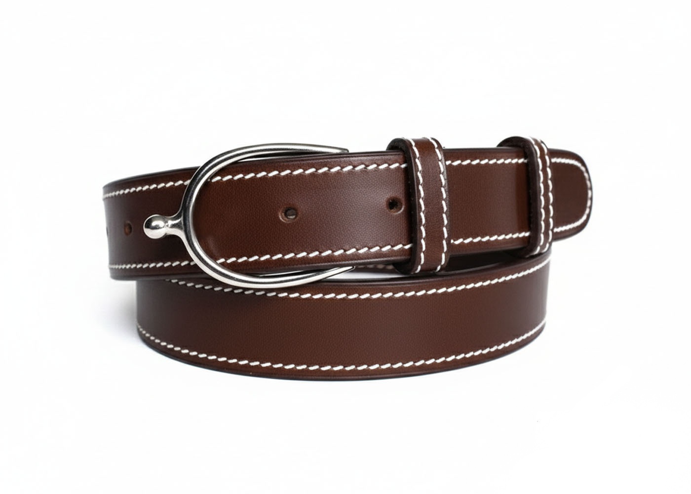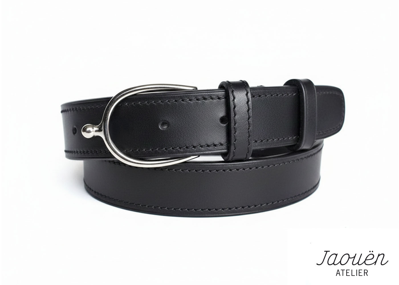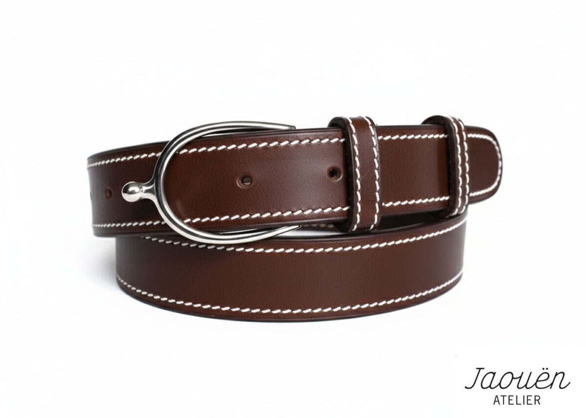 Beaucoup d’élégance pour cette ceinture femme fabriquée dans un cuir au tannage végétal de premier choix. La boucle (fabriquée en France) en forme d’éperon apporte un style sellier & équestre. Deux passants joliment piqués au fil blanc permettent d’avoir un ajustage parfait de la ceinture. Fabriqué en Bretagne dans notre atelier. Pour son entretien, pensez au Lait nourrissant (rubrique entretien).